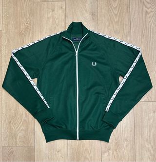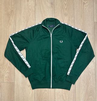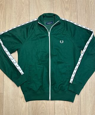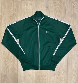 Chaqueta deportiva Fred Perry en color verde. Presenta un diseño clásico con detalles distintivos en las mangas. - Logo de Fred Perry bordado en el pecho. - Cinta con logo en las mangas. - Cierre de cremallera frontal. - Cuello alto.