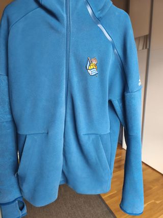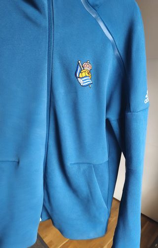 Chaqueta deportiva de la Real Sociedad. Es de tela gruesa, abrigadita y tiene capucha. Con el escudo bordado. - Bolsillos frontales. - Puños con abertura para pulgar. Talla M de chico o L de chica. Si compras más de un artículo de hombre en mi perfil, te hago descuento.