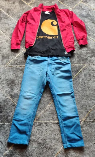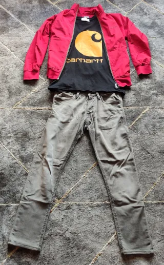 Outfit casual Carhartt chaqueta+ 2 camisetas+ 4 jeans. Talla S. - Chaqueta bomber roja Carhartt. - Camiseta negra con logo Carhartt y camiseta biker. - cuatro jeans Pull bear y Jack&Jones.