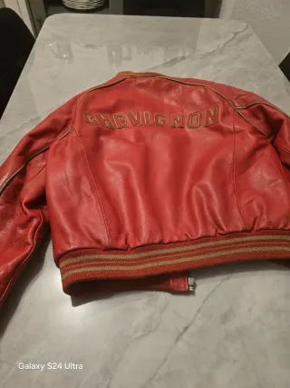 Chaqueta estilo beisbolera de la marca Chevignon. - Mangas de cuero color beige. - Cuerpo principal de cuero color rojo. - Cuello y puños con rayas. - Cierre de botones a presión.