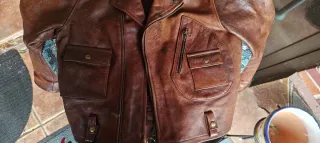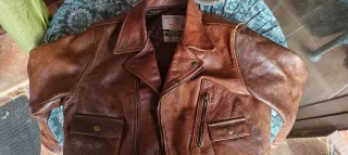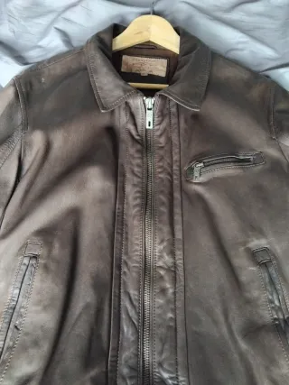 Chaqueta de cuero de la marca Chevignon, con un diseño estilo aviador/motera de cuero. Comprada aproximadamente hace 20 años. - Material: Cuero - Color: Marrón - Talla: L (equivalente a 42-44 / 52-54)