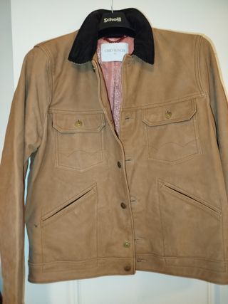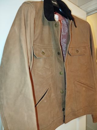 Cazadora estilo ranchera de ante. - Cuello de pana. - Forro interior con estampado. - Cierre de botones. - Bolsillos delanteros con solapa. - Bolsillos laterales inclinados.