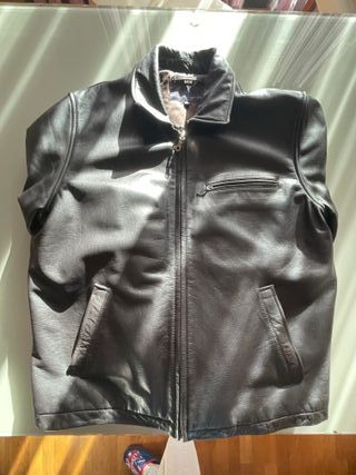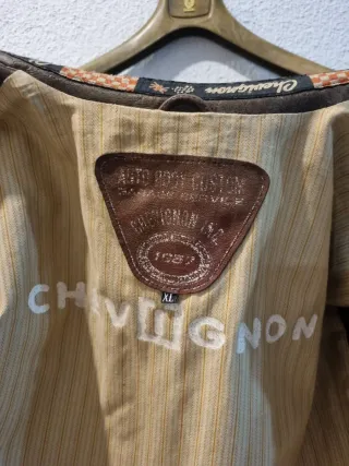 Chaqueta de cuero original de la marca Chevignon. - Diseño tipo bomber. - Cuello y puños con detalles de rayas. - Cremallera frontal. - Bolsillos laterales con ribete. La rescate del armario, con intención de volver a usarla, por lo que la llevé a un peletero para limpieza y nutrido del cuerpo, el tratamiento normal para chaquetas de cuero bueno. Me la he puesto un par de veces, pero por mucho que me guste y me traiga recuerdos, ya no me termino de ver con ella. Tiene algún enganche en los puños, pero es normal en este tipo de chaquetas, hay que tener en cuenta que se disfrutó mucho en su momento de ella. No hago devoluciones.