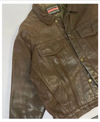 Chaqueta estilo trucker de cuero marrón de los años 90. - Cierre de botones metálicos. - Dos bolsillos en el pecho con solapa. - Cuello clásico. - Puños ajustables.