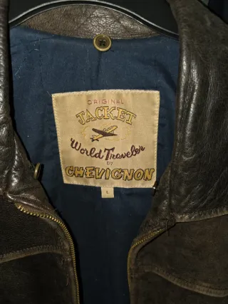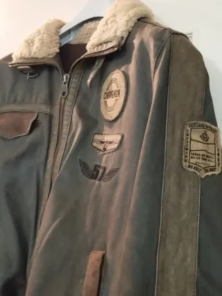 Chaqueta estilo aviador de la marca Chevignon. Presenta parches decorativos y un diseño desgastado. - Cuello forrado de borreguito. - Cierre de cremallera. - Bolsillos frontales. - 100% algodón y cuero