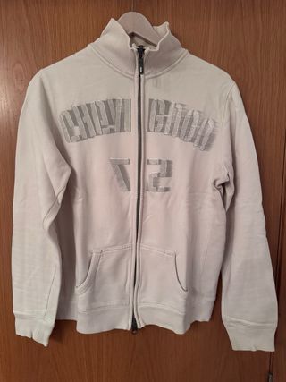 Chaqueta deportiva Chevignon en color beige. Presenta un diseño moderno con detalles bordados. - Cierre completo con cremallera. - Cuello alto. - Bolsillos frontales. - Puños y bajo elásticos.