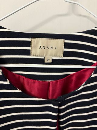 Chaqueta de la marca ANANY con un diseño llamativo. - Estampado de rayas azules y blancas. - Adorno de flecos multicolores en el bajo. - Detalle de abalorios dorados en el bajo. - Como nueva.