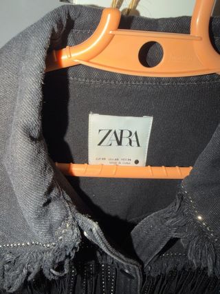 Cazadora vaquera de Zara con un diseño único. - Pone en la etiqueta talla S pero tambien vale para una talla M. - Detalle de pedrería y flecos en la parte delantera. - Cierre de botones metálicos. - Puños abotonados.