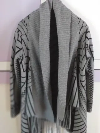 Chaqueta de punto con un diseño étnico moderno y llamativo. Su corte abierto y los flecos le dan un toque bohemio.Es talla única Va abierta está en buen estado.Tengo más cosas en mi perfil - Diseño geométrico en negro sobre fondo gris. - Acabado con flecos en el bajo. - Tejido suave y cómodo.