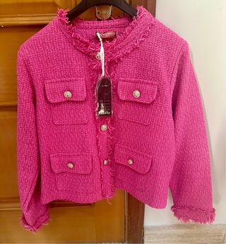 Chaqueta tipo blazer de la marca MENG LU, con un diseño moderno y detalles desflecados. - Color rosa fucsia - Acabado con flecos en cuello, puños y bajo. - Cierre de botones dorados. - Dos bolsillos frontales con solapa y botón. - talla unica sirve para tallas L/XL