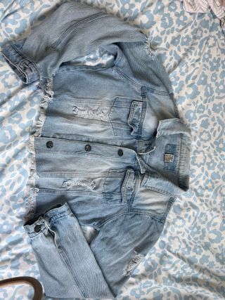 Chaqueta vaquera con un diseño llamativo y detalles brillantes. - Flecos decorativos en la parte delantera. - Adornos de pedrería que aportan brillo. - Acabado desgastado en cuello, puños y bajo. -Vale tanto para una XS como una S