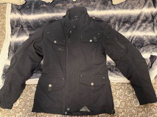Membrana fija D-Dry impermeable y transpirable con forro térmico desmontable y entradas de aire. Incorpora protecciones compuestas certificadas en hombros y codos. Cintura, cuello y muñecas ajustables y dispone de sistema de unión chaqueta-pantalón. 2 bolsillos exteriores. 1 bolsillo interior. 1 bolsillo en el forro térmico. La chaqueta esta puesta de dos días, no tiene fallos ni imperfecciones. Está en muy buen estado. La talla de marca es la 42, para el resto de prendas y cazadoras utilizo una S o M (como equivalencia).
