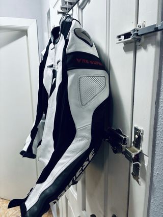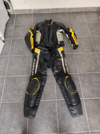 Traje de cuero Dainese en colores negro y azul. Diseñado para motociclismo. - Paneles elásticos para mayor movilidad. - Protecciones integradas. - Cremalleras de ventilación.