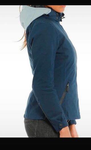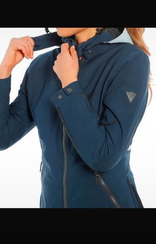 Chaqueta Dainese Mayfair D Dry para mujer en talla 40. Diseño moderno y funcional. - Color azul marino. - Material D Dry. - Cierre de cremallera frontal. - Puños ajustables con botones a presión. - Logo triangular en la manga. - Prenda muy difícil de encontrar. Descatalogada - Protecciones extraíbles - Impermeable - Capucha