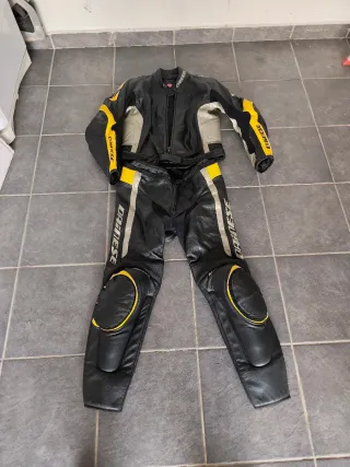 Mono de motorista de dos piezas con detalles en amarillo y negro. - Chaqueta con cremallera frontal. - Pantalón con protecciones. - Diseño deportivo.