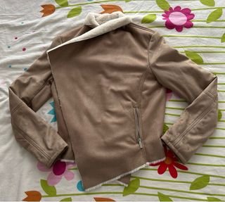chaqueta zara en rosa palo preciosa de ante por fuera y borregito por dentro muy calentita , con cremallera y detalles en las mangas también con cremallera que se puede subir y bajar.