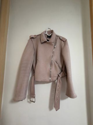 Chaqueta de estilo motero en tono rosa, con un diseño moderno y detalles cuidados. - Material tipo ante. - Cierre de cremallera asimétrica. - Cinturón ajustable con hebilla. - Solapas de solapa. - Hombreras con botón a presión.