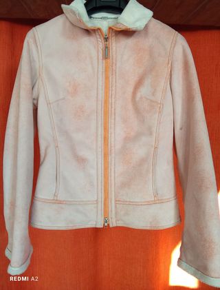 Chaqueta de piel auténtica tipo ante , de la marca Mango, en un precioso color anaranjado coral. Es de talla L y cierra con cremallera por delante. Está forrada por dentro, tiene varios bolsillos y trabillas a ambos lados de la cintura. Está en buen estado porque ha sido poco usada, pero al ser tan clara, presenta algunas manchas en los puños, de los roces. Requiere limpieza, en seco.