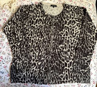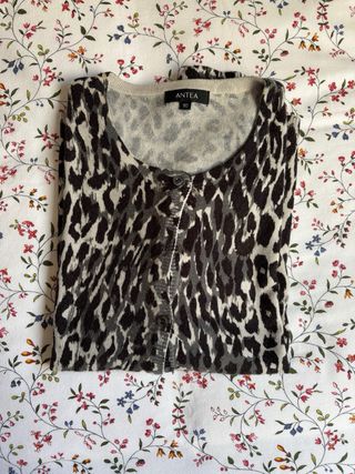 Chaqueta de punto con un llamativo estampado de leopardo en tonos grises y negros. Es una prenda cómoda y versátil. - Diseño de manga larga. - Cierre de botones en la parte frontal. - Cuello redondo.