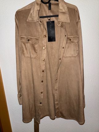 Camisa larga de estilo camisero con un suave efecto ante. Es una prenda versátil y moderna. - Cierre de botones dorados. - Dos bolsillos en el pecho con solapa. - Cuello camisero clásico.
