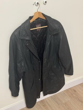 Chaqueta larga de cuero, ideal para un estilo clásico y elegante. - Material: Cuero genuino. - Diseño: Chaqueta larga con botones. - Bolsillos: Dos bolsillos frontales.
