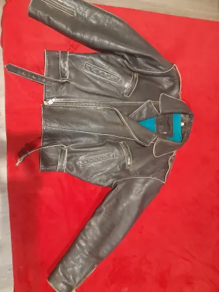 Chaqueta de cuero estilo biker, con detalles en rojo. Marca, the genuine leather - Diseño clásico de cuero. - Cremalleras plateadas. - Cuello alto.