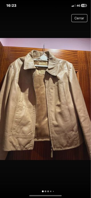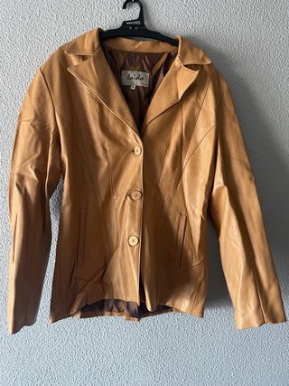 Chaqueta de cuero en tono beige, con un diseño clásico y elegante. - Material: Cuero - Color: Beige y marrón