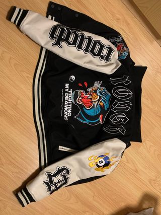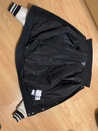 Chaqueta estilo varsity con mangas de cuero y cuerpo de tela. - Diseño con parches y bordados. - Combinación de colores negro y blanco.