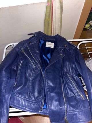 Chaqueta de cuero estilo motero en color azul marino. - Cuello redondo con cierre de botón. - Cremallera frontal. - Dos bolsillos con cremallera en el pecho. - Detalle de pespuntes en la zona de los bolsillos y el bajo.