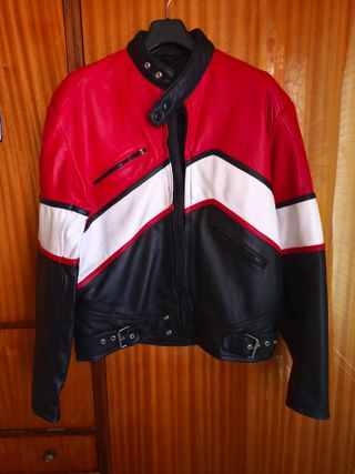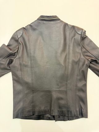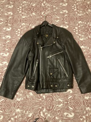 Cazadora de cuero con un diseño clásico de motero. No tiene desperfectos ni rotos. - Cuello alto con cierre de cremallera. - Bolsillos frontales con cremallera. - Puños con botón. En muy buen estado. Ha sido cuidada y se vende por falta de uso. Precio negociable.