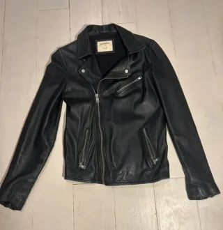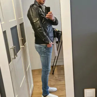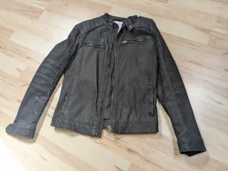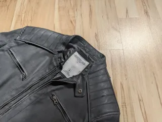 Chaqueta de cuero con un diseño moderno y detalles únicos. Talla M (175/100A) -Cuello y comisuras de mangas desgastados (vease foto) - Cierre frontal con cremallera. - Bolsillos laterales con cremallera. - Puños y cuello con detalles. - Acabado mate.