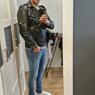 Chaqueta de cuero auténtico, un clásico atemporal. - Cuello solapa. - Cinturón ajustable en la cintura. - Cremalleras metálicas. La chaqueta esta en muy buen estado, solo tiene un pequeño desgaste en la zona de los hombros, se puede ver en las imagenes que he adjuntado. La chaqueta en su momento me costo 400€ debido a que es cuero auténtico, y pesa.