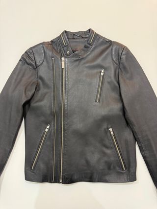 Chaqueta de cuero estilo motero. Entrego en mano en Madrid. - Cierre frontal con cremallera. - Bolsillos con cremallera. - Cuello con solapas y botones a presión.
