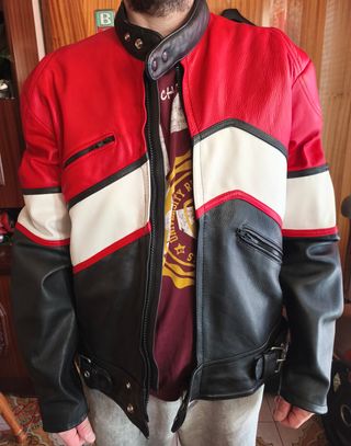 Chaqueta de cuero estilo motero con diseño inspirado en Ferrari Racing. - Color rojo vibrante con detalles en negro y amarillo. - Inscripciones Ferrari RACING y otros parches. - Logos de NGK, Michelin y Shell. - Inscripciones RACING en las mangas. - Cuero de altísima calidad. - Talla XXL, pero talla muy pequeño, corresponde a una S (ver medidas en fotos) - Se ga usado 2-3 veces, prácticamente nueva, sin marcas ni arrugas en la piel, mira las fotos. - Costó 800€