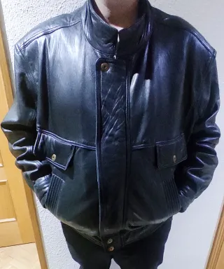 Chaqueta para hombre de cuero de piel colombiana. Diseño clásico y elegante. Hecha en Bogotá con piel de vacuno 100%. De la marca Marruecos. XL de talla . Mido 1,81 y peso 85 Kg y no me queda justa Apenas utilizada NO se aceptan devoluciones. Se puede probar en Madrid sin ningún problema - Cierre de botones. - Dos bolsillos. - Cuello camisero.