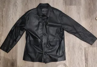 Sobrecamisa de cuero negra, caracterizada por su cuello camisero tradicional y dos bolsillos con solapa en el pecho, con acabado de ante en su interior, detalle común en prendas de piel de alta calidad, donde el cuero no lleva un forro de tela separado, sino que muestra el reverso natural de la piel, lo que la hace más suave al tacto y cálida. Puede usarse como una camisa cerrada o como una chaqueta ligera (sobrecamisa) abierta sobre una camiseta. - Talla: G (equivale a L / 40 / 12). Presenta botones frontales a presión. La última fotografía es de un modelo parecido(no es la camisa en venta), mostrando el color real de la prenda.