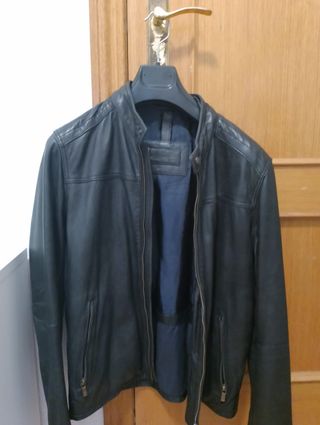 Chaqueta de piel auténtica Massimo Dutti, color negro, talla M. En muy buen estado general, sin manchas ni rozaduras importantes. Conserva el olor a cuero natural y está muy bien cuidada. Piel ovina 100%, muy suave al tacto se nota la calidad de material. Forro interior de algodón (cuerpo) y poliéster (mangas) Corte clásico, ideal para entretiempo o invierno. Precio 200 € (negociable dentro de lo razonable). Precio pvp de la compra original 300€