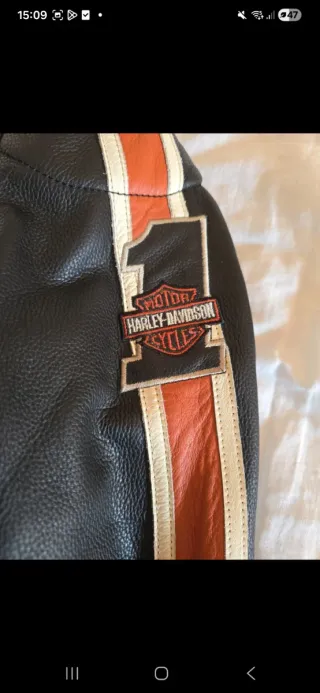 Cazadora cuero estilo motero con detalles en naranja y blanco. Presenta un diseño clásico y atemporal. - Logo de Harley-Davidson en el pecho. - Cremallera frontal. - Bolsillo con cremallera en el lateral.