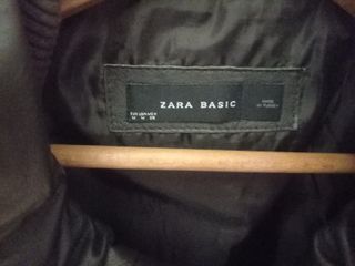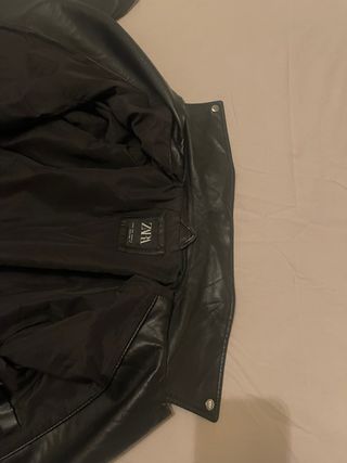 Chaqueta de estilo bomber en cuero sintético. - Cierre de cremallera. - Bolsillos laterales con cremallera. - Cinturón ajustable en la parte inferior. la única imperfección que tiene es ese hilo blanco (última foto) ZARA TALLA S