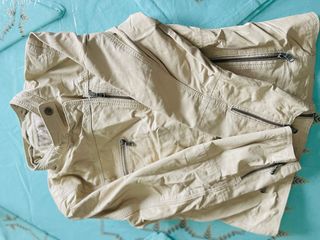 Chaqueta estilo motero en color beige. - Sin usar. - Cierre de cremallera. - Bolsillos con cremallera. - Solapas de muesca. - Puños con cremallera. - Pequeña mancha en la manga (prácticamente inapreciable)