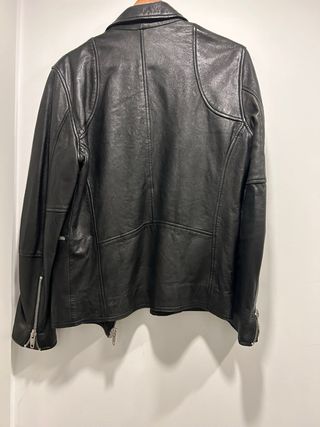 Chaqueta de cuero de buen material. Es la que suele estar alarmada en Zara (por eso digo que es la buena).