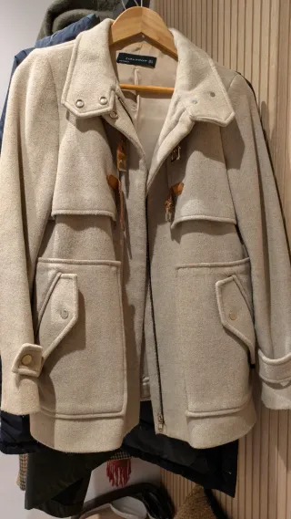Chaqueta de paño en color beige de Zara. - Cierre con botonesy cremallera. - Bolsillos delanteros con solapa. - Detalle de cuero que ha dejado marca en la chaquera, ver foto