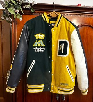 Chaqueta estilo varsity con un diseño único y llamativo. - Mangas de cuero sintético negro. - Paneles de tela en verde y amarillo. - Detalles bordados y parches. - Puños y cuello de canalé con rayas.