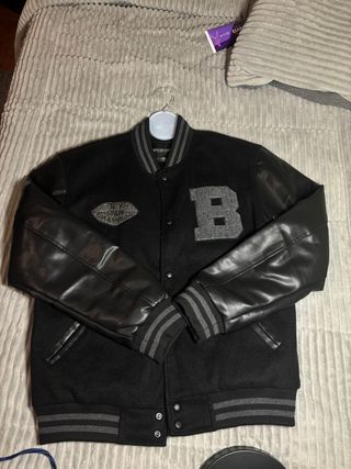 Chaqueta bomber estilo universitario con un diseño moderno. - Mangas de cuero sintético. - Cuerpo de lana. - Parche NY State Champion en el pecho. - Letra B grande en fieltro en el pecho. - Puños y cintura de punto acanalado con rayas grises.