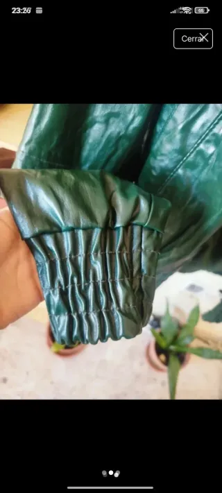 Chaqueta de cuero sintético en perfectas condiciones,cuello alto con detalle, puños y cintura elásticos,cierre de cremallera frontal.