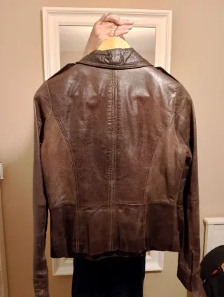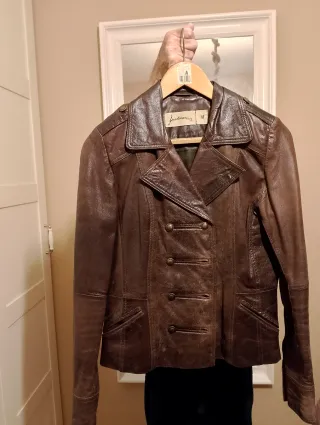 Chaqueta de cuero de mujer .comprada en peletería Está prácticamente nueva La puse 5 veces comoucho Tiene su botonera en condiciones Hace una talla 42 . Los puños y cuello impecables. Que es ahí donde se puede ver el desgaste que no hay .