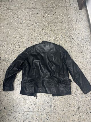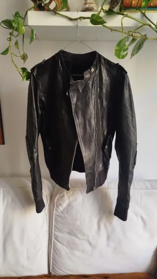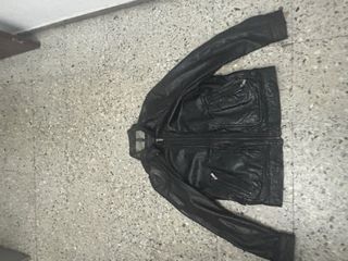 Chaqueta de cuero negra con forro interior. De cuero bueno de verdad. Talla M ancha ( tirando a L ) - Cierre de cremallera. - Cuello alto con hebilla. - Bolsillos frontales con cremallera.