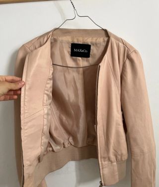 Chaqueta de cuero en tono rosa palo casi beige, con un diseño moderno y elegante. - Cierre de cremallera frontal. - Bolsillos laterales con cremallera. - Puños y bajo elásticos.