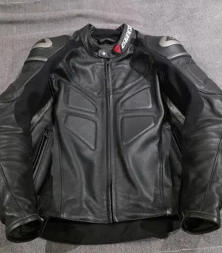 Chaqueta de cuero Dainese en color negro. - Diseño con protecciones en hombros. - Cremalleras en puños y bolsillos. - Cuello alto con cierre. - Paneles elásticos en mangas.