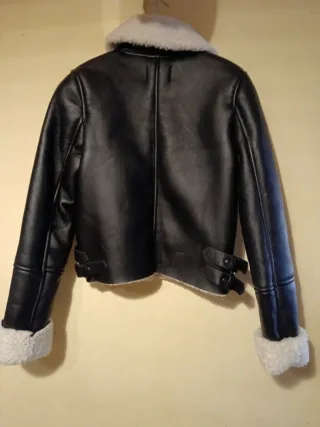 Chaqueta estilo aviador de Stradivarius, ideal para el frío. - Diseño de cuero sintético. - Forro interior y cuello de borrego sintético. - Cremallera frontal asimétrica. - Bolsillos con cremallera. Nueva.(sin taras)